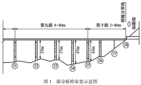 某10聯(lián)現(xiàn)澆預(yù)應(yīng)力混凝土連續(xù)箱梁橋地處山嶺重丘區(qū),跨越河谷,起點(diǎn)與另一特大橋相連,終點(diǎn)與一隧道相連,部分橋跨布置示意圖如圖1所示。