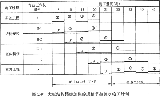 某建設(shè)工程由四幢大板結(jié)構(gòu)樓房組成,每幢樓房為一個施工段,施工過程劃分為基礎(chǔ)工程、結(jié)構(gòu)安裝、室內(nèi)裝修和室外工程4項,其流水節(jié)拍分別為:5周、10周、10周、5周。一般的成倍節(jié)拍流水施工進(jìn)度計劃如圖2—8所示。