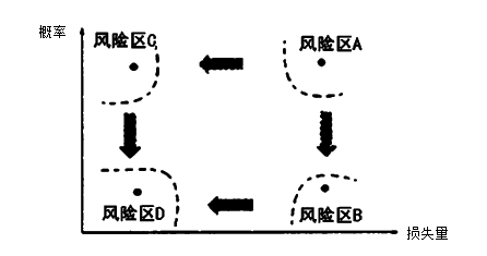 若某事件經(jīng)過風(fēng)險(xiǎn)評估,它處于風(fēng)險(xiǎn)區(qū)A,則應(yīng)采取措施,降低其概率,以使它移位至風(fēng)險(xiǎn)區(qū)B;或采取措施降低其損失量,以使它移位至風(fēng)險(xiǎn)區(qū)C.風(fēng)險(xiǎn)區(qū)B和C的事件則應(yīng)采取措施,使其移位至風(fēng)險(xiǎn)區(qū)D.