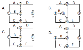 【例題】某工程有A、B、C、D、E五項(xiàng)工作,其邏輯關(guān)系為A、B、C完成后D開始,C完成后E才能開始,則據(jù)此繪制的雙代號網(wǎng)絡(luò)圖是( )。