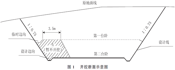 K5+630~K5+810的平均挖方深度7m左右,施工單位采用的某一開挖斷面示意如圖1,要求上下錯(cuò)臺(tái)同時(shí)掘進(jìn)。