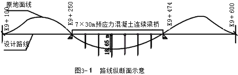 某段高速公路樁號(hào)為K0+000~K13+700,交通荷載等級為重交通。K9+362處有一座7×30m預(yù)應(yīng)力混凝土T型梁橋,橋梁造價(jià)1000萬元(含橋面鋪裝、交通安全設(shè)施等所有工程),K9+100~K9+600路線縱斷面示意圖見圖3-1。施工單位中標(biāo)進(jìn)場后,經(jīng)初步考察,擬組織下列機(jī)械進(jìn)場:A.挖掘機(jī);B.纜索式起重機(jī);C.羊足碾;D.旋挖鉆機(jī);E.架橋機(jī);F.打樁機(jī);G.平地機(jī);H.大噸位千斤頂;I.壓路機(jī);J.自卸汽車等。