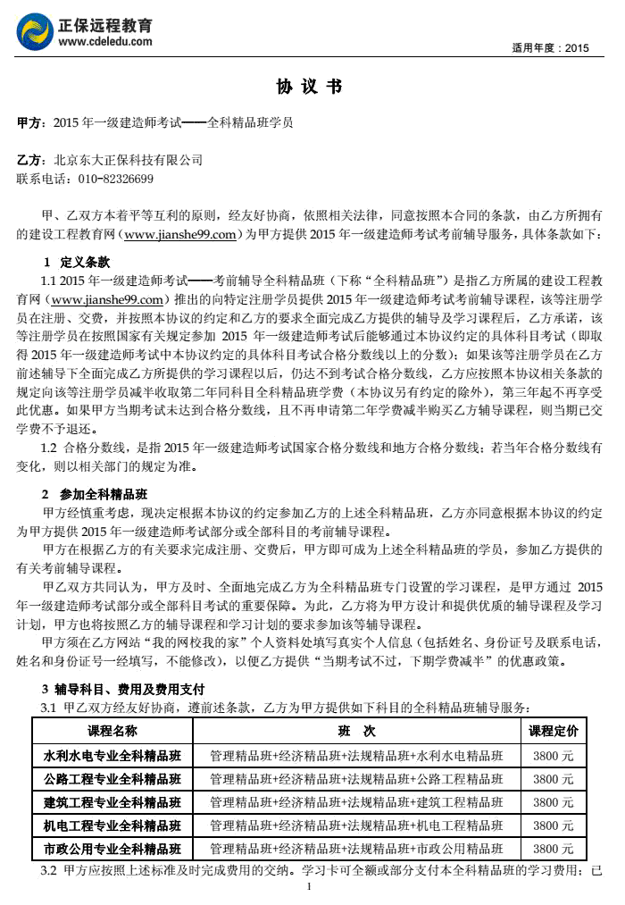 一級(jí)建造師全科“精品班”協(xié)議書(shū)