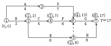 答:1.用標(biāo)號(hào)法找關(guān)鍵線路,計(jì)算工期。如下圖所示。則計(jì)劃關(guān)鍵線路為:B-C―F-G;計(jì)劃工期為17天。