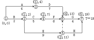 2.用標(biāo)號(hào)法找關(guān)鍵線路,計(jì)算工期,如下圖所示。則實(shí)際關(guān)鍵線路為:B-E―H;實(shí)際工期為19天。