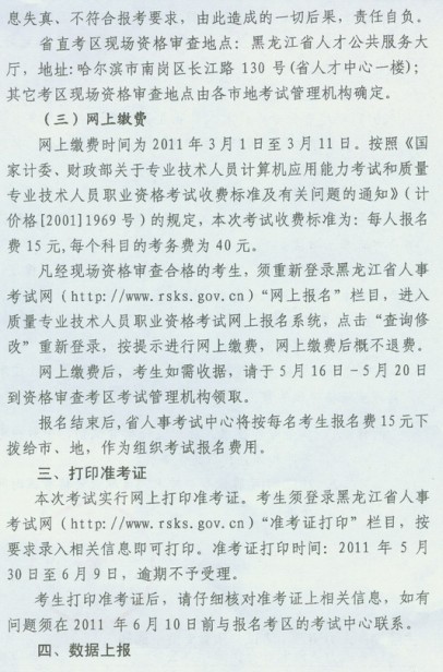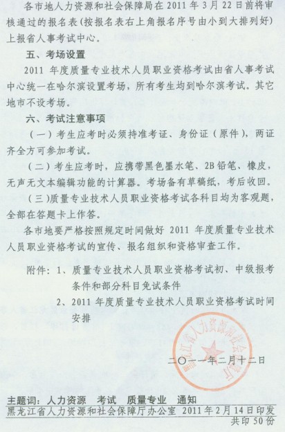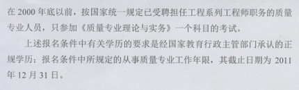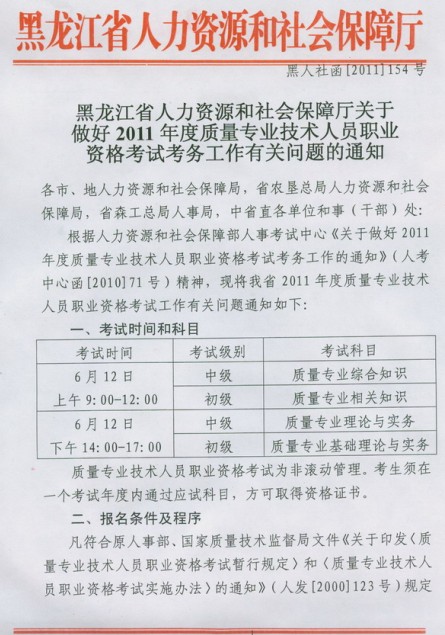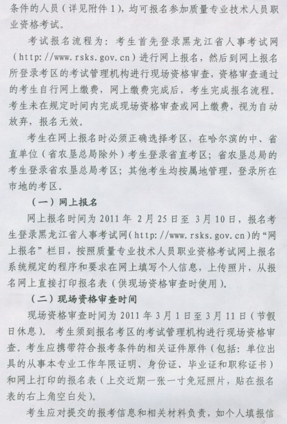 黑龍江省2011年質(zhì)量專業(yè)考試報名時間為2月25日至3月10
