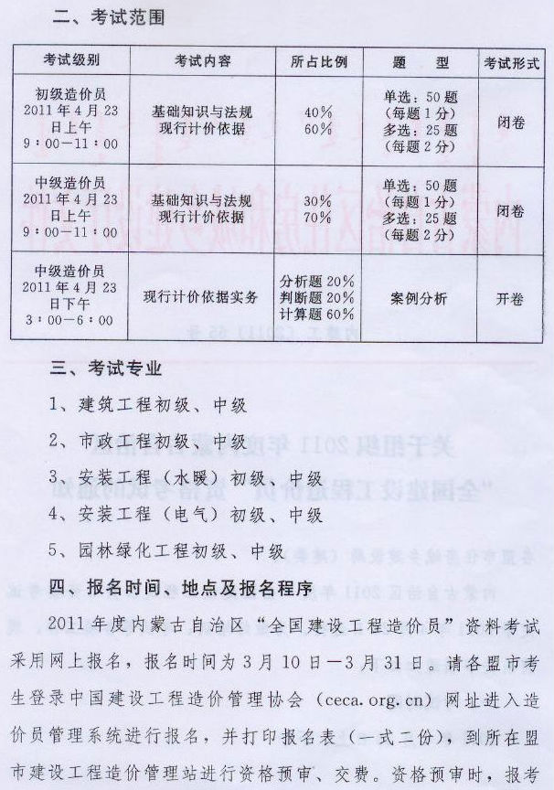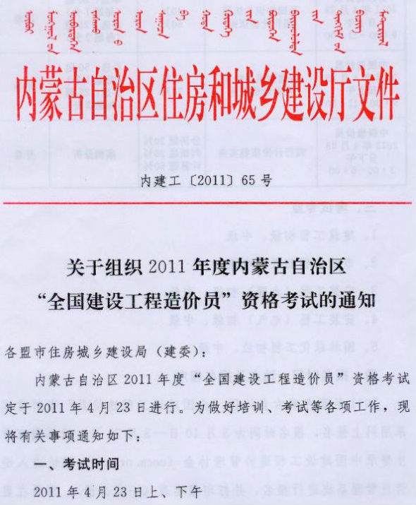 2011年內(nèi)蒙古造價員考試報名時間為3月10日-31日