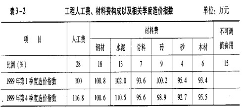 表3-2工程人工費(fèi)、材料費(fèi)構(gòu)成以及相關(guān)季度造價(jià)指數(shù)單位:萬(wàn)元