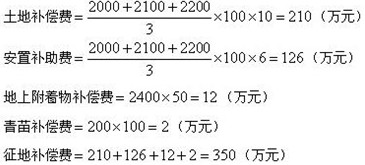6、某建設(shè)項(xiàng)目,需要征用耕地100畝,該耕地被征用前三年平均每畝年產(chǎn)值分別為2000元、2100元和2200元,土地補(bǔ)償費(fèi)標(biāo)準(zhǔn)為前三年平均年產(chǎn)值的10倍;被征用單位人均占有耕地1畝,每個(gè)需要安置的農(nóng)業(yè)人口的安置補(bǔ)助費(fèi)標(biāo)準(zhǔn)為該耕地被征用前三年平均年產(chǎn)值的6倍;地上附著物共有樹木2400棵,補(bǔ)償標(biāo)準(zhǔn)為50元/棵,青苗補(bǔ)償標(biāo)準(zhǔn)為200元/畝,則該征地補(bǔ)償費(fèi)為(  )。