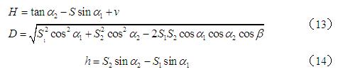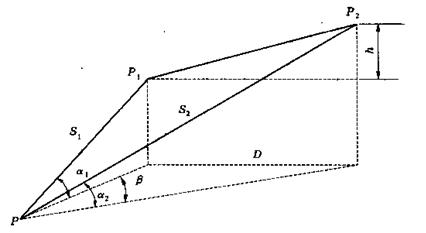 在與P1、P2通視的任一點(diǎn)P上安置全站儀,首先觀測(cè)P至P1、P2的斜距S1、S2,豎直角α1、α2,以及PP1至PP2間的水平夾角β,然后可由余弦公式計(jì)算P1P2的平距D和高差h: