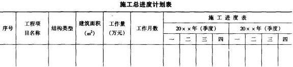 施工總進(jìn)度計(jì)劃可以用橫道圖表達(dá),也可以用網(wǎng)絡(luò)圖表達(dá)。由于施工總進(jìn)度計(jì)劃只是起控制性作用,因此不必搞得過細(xì),若把計(jì)劃編得過細(xì),由于在實(shí)施過程中情況復(fù)雜多變,調(diào)整計(jì)劃反而不便。當(dāng)用橫道圖表達(dá)總進(jìn)度計(jì)劃時(shí),項(xiàng)目的排列可按施工總體方案所確定的工程開展程序排列。橫道圖上應(yīng)表達(dá)出各施工項(xiàng)目的開竣工時(shí)間及其施工持續(xù)時(shí)間。如下表所示為施工總進(jìn)度計(jì)劃的表格形式。