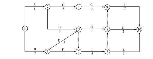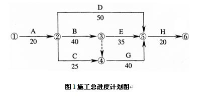 [例1]某建設(shè)單位和施工單位按照《建設(shè)工程施工合同(示范文本)》簽訂了施工合同,合同中約定建筑材料由建設(shè)單位提供,由于非施工單位原因造成的停工,機(jī)械補(bǔ)償費(fèi)為200元/臺(tái)班,人工補(bǔ)償費(fèi)為50元/日工;總工期為120天;竣工時(shí)間提前獎(jiǎng)勵(lì)為3000元/天,誤期損失賠償費(fèi)為5000元/天。經(jīng)項(xiàng)目監(jiān)理機(jī)構(gòu)批準(zhǔn)的施工進(jìn)度計(jì)劃如圖1所示(單位:天)。
