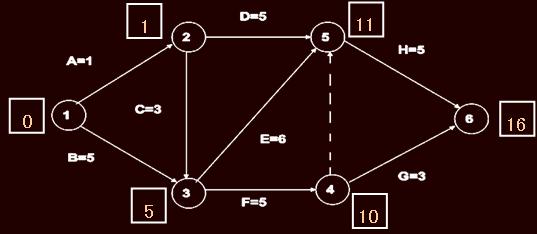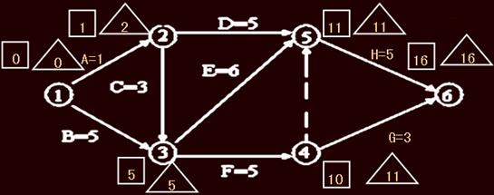 關(guān)鍵線路為1-3-5-6,計(jì)算工期為16個(gè)月。