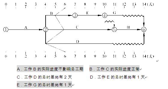 例題:某分部工程雙代號(hào)時(shí)標(biāo)網(wǎng)絡(luò)計(jì)劃執(zhí)行到第6天結(jié)束時(shí),檢查其實(shí)際進(jìn)度如下圖前鋒線所示,檢查結(jié)果表明(ABE)。