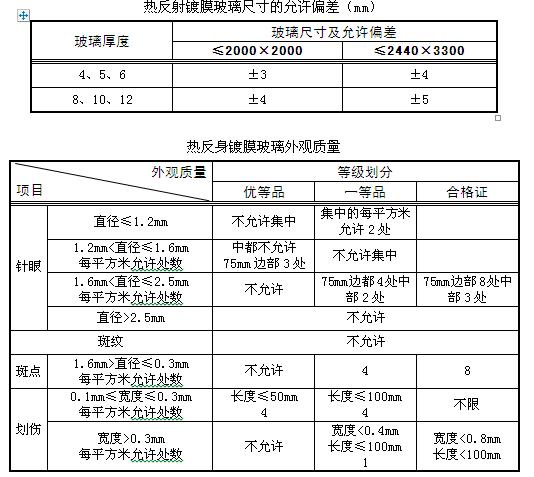 (2)玻璃幕墻采用玻璃的外觀質(zhì)量和性能應(yīng)符合國家現(xiàn)行標(biāo)準(zhǔn)的規(guī)定。當(dāng)采用熱反射鍍膜玻璃對允許偏差及外觀質(zhì)量應(yīng)符合下表規(guī)定。