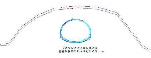 外岙一號隧道位于浙江省慈溪市茶亭南外岙自然村。隧道起訖里程:DK111+345~DK111+494,全長149m。經(jīng)過現(xiàn)場勘查,在外岙1#隧道山頂有一直徑Ф30cm的慈溪天然氣管道,該段天然氣管道設(shè)計壓力為4Mpa,管道在隧道線路里程DK111+410,方向大致與杭甬客專線路方向垂直。管道在山頂埋深約1.2m,距離DK111+410隧道斷面洞頂垂直距離約14m(附斷面圖)。進出口距離管道的距離分別為65m和84m。