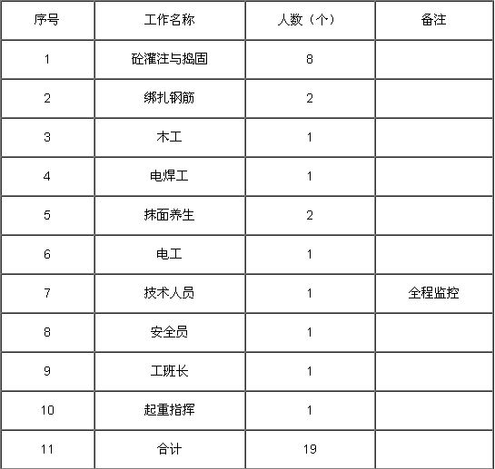 施工前對施工中勞力進行技術(shù)培訓,安全教育,并對其進行優(yōu)化組合,保證施工進度。(如:表1)
