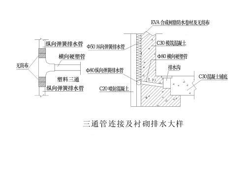 在隧道兩側(cè)墻腳初期支護與二次襯砌之間分別Φ80彈簧軟式透水管作為縱向排水,環(huán)向透水管與縱向透水管相接處采用三通管相連接,在縱向排水管與水溝之間用Φ80硬塑管相連(如下圖),使圍巖的裂隙水經(jīng)環(huán)向透水管、縱向排水管及橫向引水管引至隧道邊溝排出洞外。