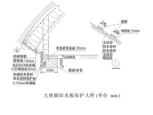 二次襯砌采用先拱后墻法施工,為防拱腳處的壓力、襯砌鋼筋的安裝、邊墻爆破炸壞防水板,在拱墻結(jié)合部防水卷材要作特殊保護措施,在拱墻結(jié)合部位施作雙層防水卷材(如下圖),在拱腳砼底部挖槽(配合拱墻鋼筋連接用),將EVA卷入槽內(nèi),槽用砂回填,回填后用水泥砂漿抹平,防止灌砼時,砼漿液流入槽內(nèi),待邊墻開挖時,再撬掉砂漿層,將防水板從小槽內(nèi)拉出,與邊墻防水板焊接,小槽寬100×100cm,沿隧道通長布置,防水板卷入小槽長度為30~50cm。同時,為使拱部二襯鋼筋與拱腳處防水板間的點接觸變?yōu)槊娼佑|,以防鋼筋刺穿防水板,對二襯環(huán)向主鋼筋增加兩塊10cm寬厚10mm的鋼墊板。