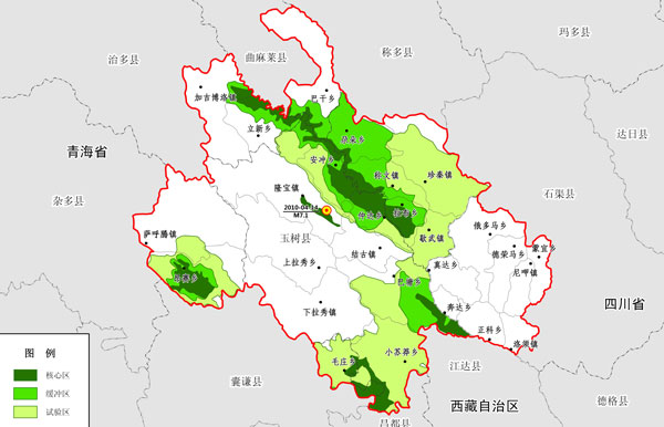 | 重 災 區(qū) | 玉樹縣 | 隆寶鎮(zhèn)、仲達鄉(xiāng)、安沖鄉(xiāng)、巴塘鄉(xiāng) | 7030 | 46910 | |