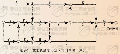 六、某工程,施工合同中約定:工期19周;鋼筋混凝土基礎(chǔ)工程量增加超出15%時(shí),結(jié)算時(shí)對(duì)超出部分按原價(jià)的90%調(diào)整單價(jià)。經(jīng)總監(jiān)理工程師批準(zhǔn)的施工總進(jìn)度計(jì)劃如圖6-1所示,其中A、C工作為鋼筋混凝土基礎(chǔ)工程,B、G工作為片石混凝土基礎(chǔ)工程,D、E、F、H、I工作為設(shè)備安裝工程,K、L、J、N工作為設(shè)備調(diào)試工作。