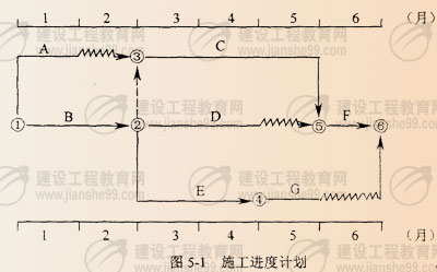 五、某工程,建設(shè)單位與施工單位按照《建設(shè)工程施工合同(示范文本)》簽訂了施工承包合同。合同約定:工期6個(gè)月;A、B工作所用的材料由建設(shè)單位采購(gòu);合同價(jià)款采用以直接費(fèi)為計(jì)算基礎(chǔ)的全費(fèi)用綜合單價(jià)計(jì)價(jià);施工期間若遇物價(jià)上漲,只對(duì)鋼材、水泥和骨料的價(jià)格進(jìn)行調(diào)整,調(diào)整依據(jù)為工程造價(jià)管理部門公布的材料價(jià)格指數(shù)。招標(biāo)文件中工程量清單所列各項(xiàng)工作的估算工程量和施工單位的報(bào)價(jià)如表5-1所示,該工程的各項(xiàng)工作按最早開始時(shí)間安排,按月勻速施工,經(jīng)總監(jiān)理工程師批準(zhǔn)的施工進(jìn)度計(jì)劃如圖5-1所示。