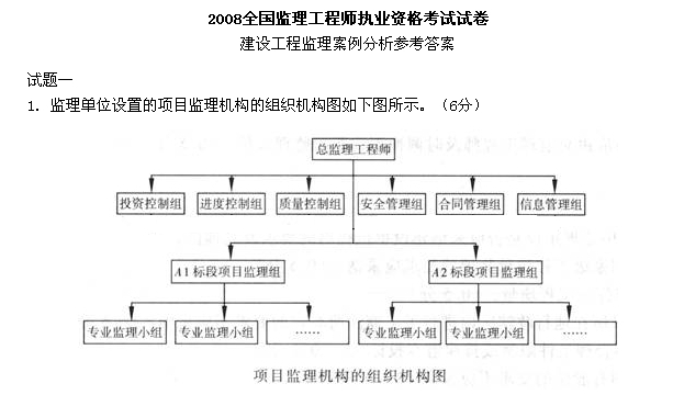 一、某工程,建設(shè)單位與甲施工單位簽訂了施工總承包合同,并委托一家監(jiān)理單位實(shí)施施工階段監(jiān)理。經(jīng)建設(shè)單位同意,甲施工單位將工程劃分為A1、A2標(biāo)段,并將A2標(biāo)段分包給乙施工單位。根據(jù)監(jiān)理工作需要,監(jiān)理單位設(shè)立了投資控制組、進(jìn)度控制組、質(zhì)量控制組、安全管理組、合同管理組和信息管理組六個(gè)職能管理部門,同時(shí)設(shè)立了A1和A2兩個(gè)標(biāo)段的項(xiàng)目監(jiān)理組,并按專業(yè)分別設(shè)置了若干專業(yè)監(jiān)理小組,組成直線職能制項(xiàng)目監(jiān)理組織機(jī)構(gòu)。