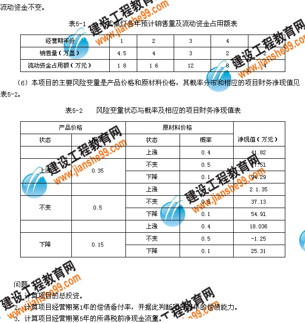 ?。?)項(xiàng)目經(jīng)營(yíng)期各年銷(xiāo)售量及流動(dòng)資金占用額見(jiàn)表5-1。為計(jì)算簡(jiǎn)便,假設(shè)生產(chǎn)標(biāo)準(zhǔn)桌燈占用的