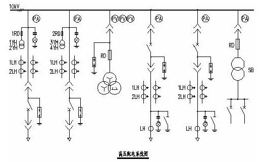 由前述可知,鍋爐房高壓供電采用雙回10kV電源,一用一備,選用兩臺變壓器,變壓器同時分列運行。因此,高壓供電系統(tǒng)可采用以下系統(tǒng),見“高壓配電系統(tǒng)圖”。