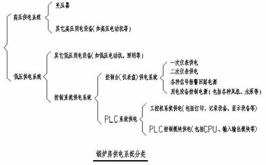 1、當(dāng)任意一臺鍋爐停止運行時,應(yīng)保證其它至少一臺鍋爐系統(tǒng)的正常運行或水循環(huán)系統(tǒng)的最基本運行,所以所有鍋爐設(shè)備電源及其控制電源不應(yīng)取自同一段母線,見“鍋爐房供電系統(tǒng)圖”。