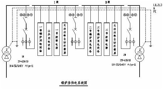由于鍋爐房系統(tǒng)運行本身的高可靠性,要求系統(tǒng)在一臺爐故障、兩臺爐故障、三臺爐故障或供電系統(tǒng)部分故障等嚴重的情況下,應(yīng)保證不造成大的經(jīng)濟損失,并能維持系統(tǒng)最基本的運行。如在全部或部分鍋爐故障的情況下,最基本的要求是要保證水循環(huán)系統(tǒng)的正常運行,否則有凍壞管路的危險,造成的損失可能是無法彌補的。反應(yīng)在供電系統(tǒng)方面,就需要選用兩臺變壓器分列運行的系統(tǒng),并設(shè)置聯(lián)絡(luò)開關(guān),這樣,在一臺變壓器故障的情況下,另一臺變壓器可保證供暖系統(tǒng)最基本的運行。另外考慮到每臺鍋爐系統(tǒng)運行的可靠性,每臺鍋爐的負荷應(yīng)由一臺變壓器供電。