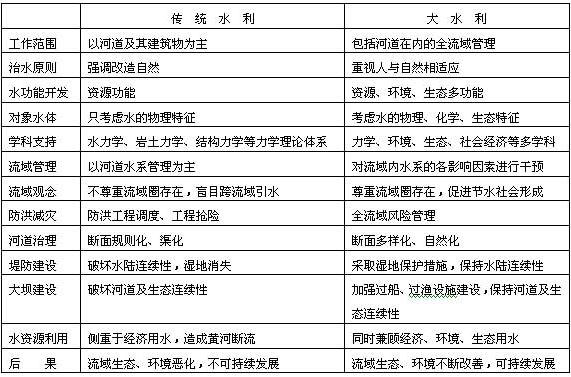 按照大水利的理論,流域規(guī)劃要全面地考慮流域的水文、自然和社會特征,即“天時”、“地利”、“人和”,以謀求流域內社會的可持續(xù)發(fā)展為規(guī)劃目標。我在過去提出的大水利理論中曾經(jīng)對新舊水利理論的差異列表進行了比較(表2),這張表有助于我們較好地理解它們本質上的差別。