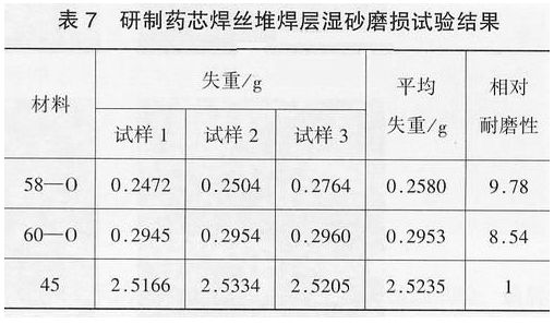 試驗(yàn)表明,在較低應(yīng)力狀態(tài)下,研制藥芯焊絲堆焊層具有相當(dāng)強(qiáng)的耐磨粒磨性能,高達(dá)45淬火鋼的8~10倍,試驗(yàn)結(jié)果如表7所示。
