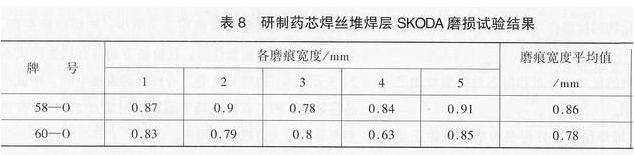 試驗(yàn)表明,在較高應(yīng)力狀態(tài)下,研制藥芯焊絲堆焊層同樣表現(xiàn)出良好的耐磨粒磨損性能,試驗(yàn)結(jié)果見(jiàn)表8。