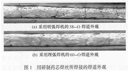 藥芯焊絲58-O,60-O的焊接工藝性能優(yōu)良:電弧燃燒穩(wěn)定,焊道成形好,飛濺少,氣孔很少,堆焊層致密無(wú)縮松,表面有少量渣點(diǎn),不予清理不影響連續(xù)多層焊接,煙塵不大,噪聲低。電弧穩(wěn)定性和飛濺程度方面同類產(chǎn)品相比有突出表現(xiàn)。表層主要缺陷為橫向微裂紋,是應(yīng)力釋放的正,F(xiàn)象,為大多數(shù)硬面堆焊所允許。