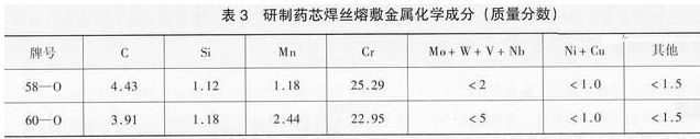 參照GB984制作堆焊試樣,經(jīng)900~1000℃、保溫40~60min、爐冷的軟化處理后鉆取粉末進(jìn)行化學(xué)滴定和紅外吸收分析,測(cè)得的研制藥芯焊絲熔敷金屬化學(xué)成分見(jiàn)表3。