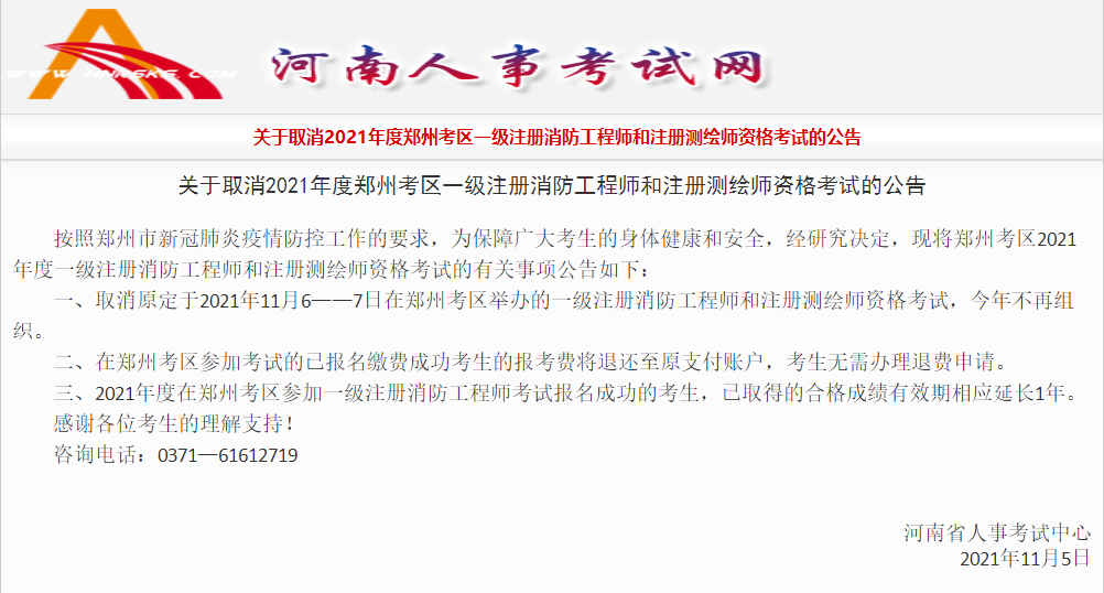 關(guān)于取消2021年度鄭州考區(qū)一級(jí)注冊(cè)消防工程師和注冊(cè)測(cè)繪師資格考試的公告