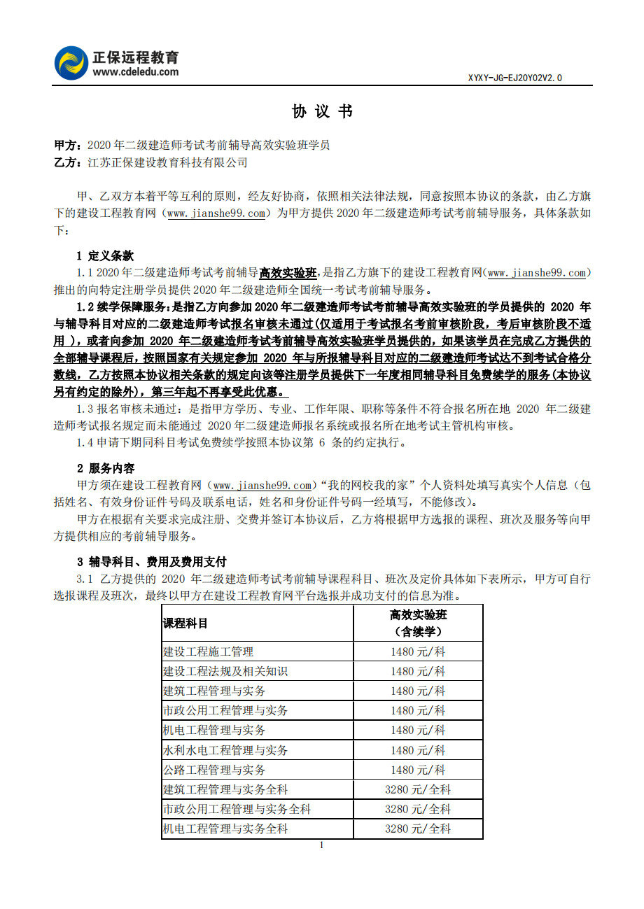 2020年二級(jí)建造師高效實(shí)驗(yàn)班協(xié)議書