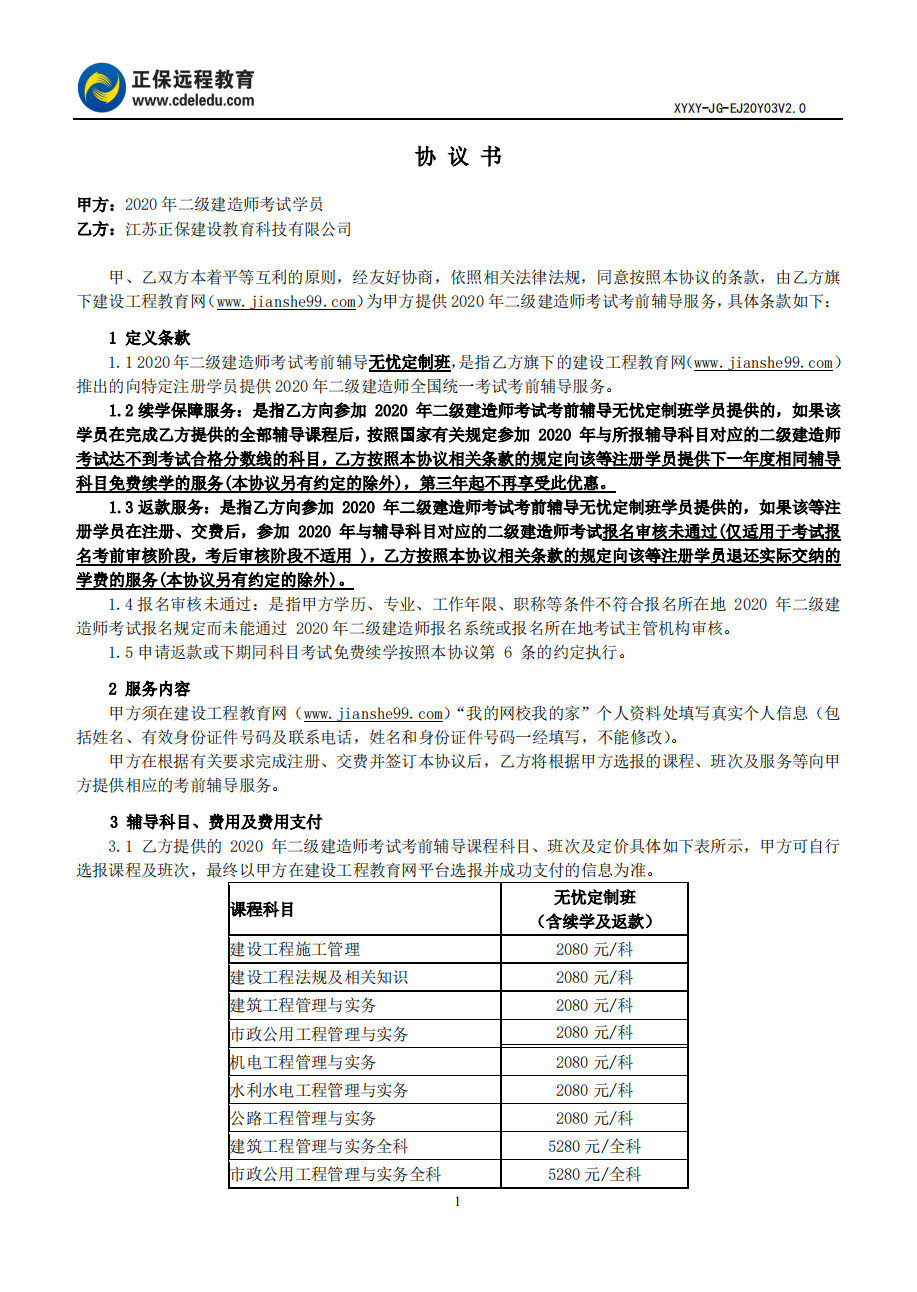 2020年二級(jí)建造師無憂定制班協(xié)議書