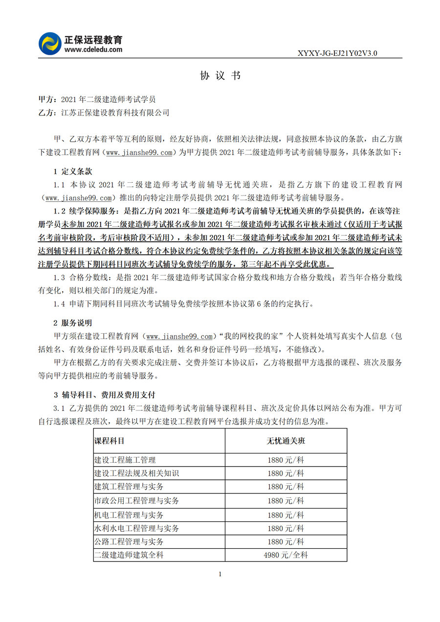 2021年二級建造師無憂通關(guān)班協(xié)議書
