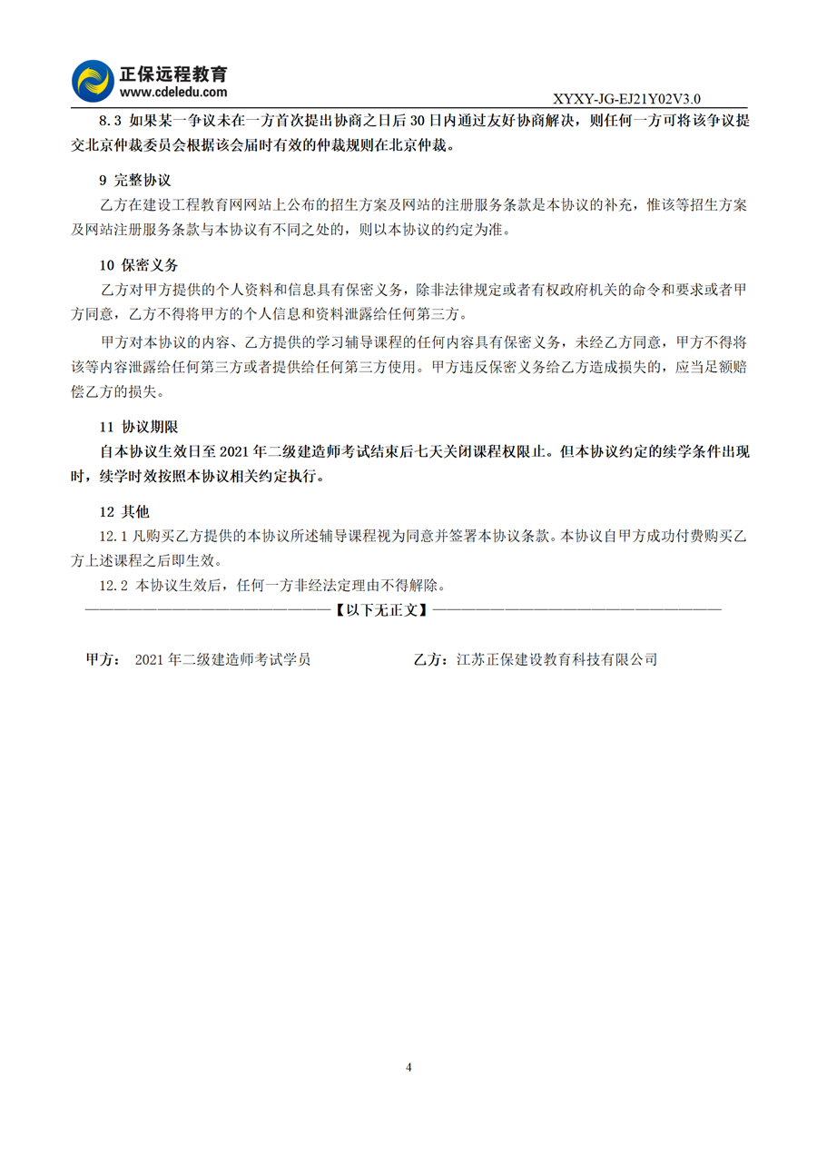 2021年二級建造師無憂通關(guān)班協(xié)議書