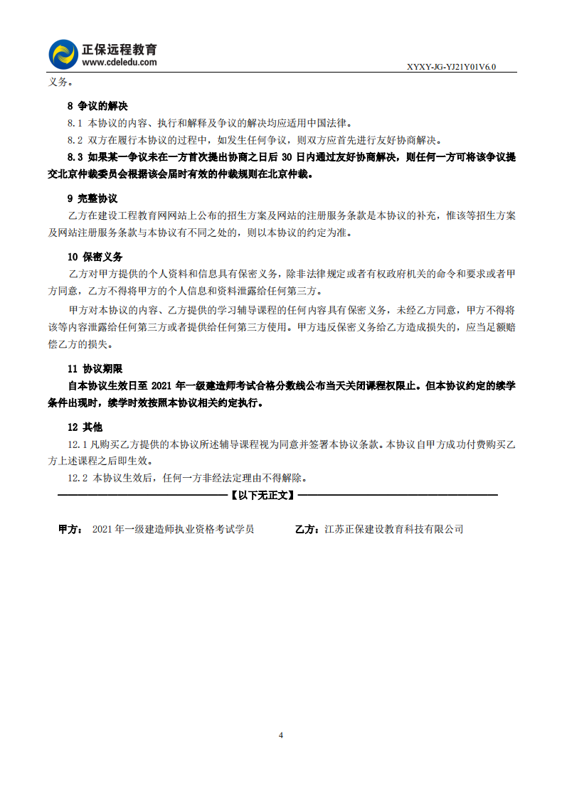 2021年一級(jí)建造師尊享無憂班續(xù)學(xué)協(xié)議書