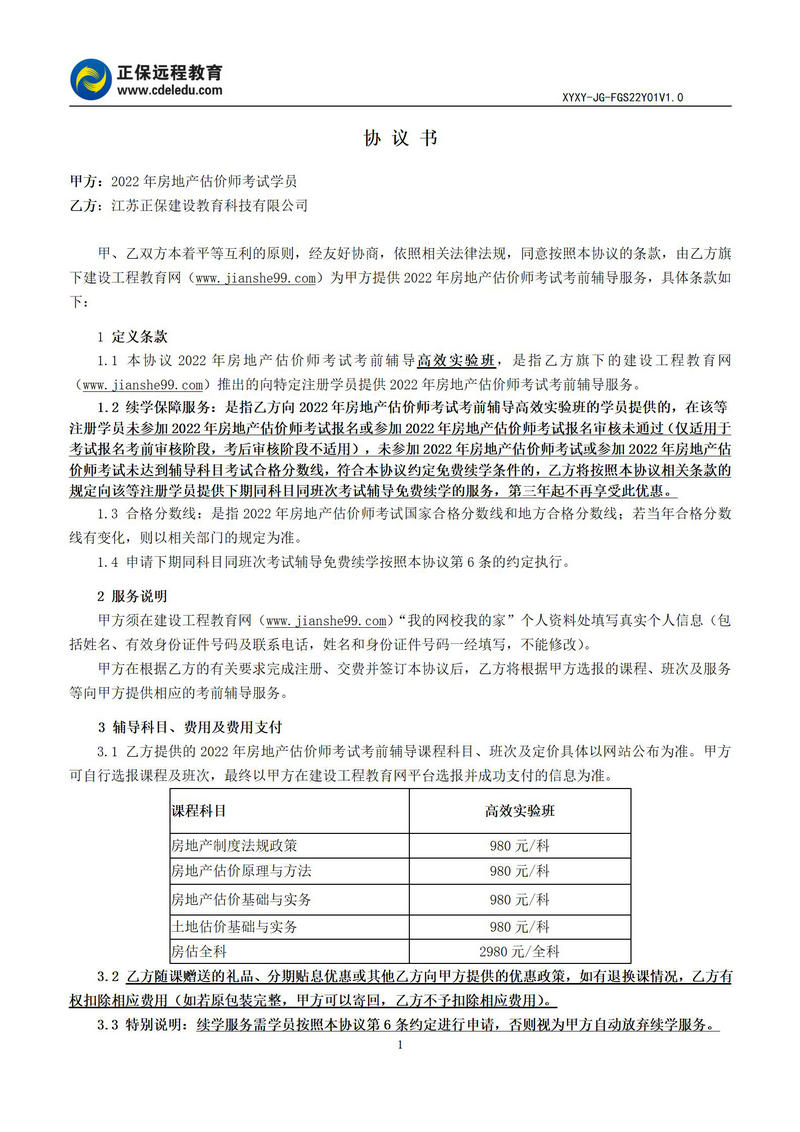 2022年房地產(chǎn)估價師高效實驗班協(xié)議書