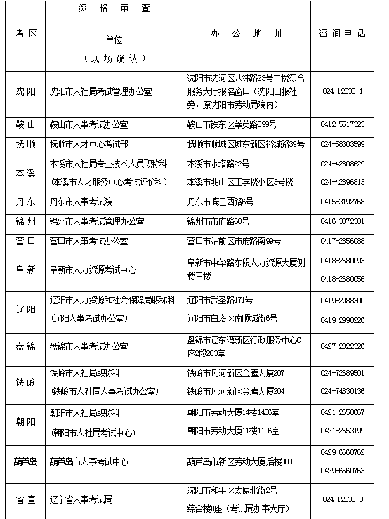 2.資格審查及報名確認(rèn)工作按屬地化原則進(jìn)行。其中,資格審查由所在市人事職稱管理部門或人事考試部門負(fù)責(zé)。報名確認(rèn)由所在市人事考試部門負(fù)責(zé)。駐沈的中、省直單位報考人員的資格審查及報名確認(rèn)由省人事考試局負(fù)責(zé)(詳見附件1)。