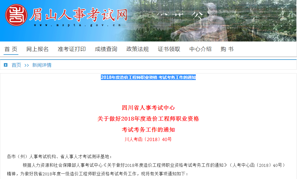 眉山2018年度造價工程師職業(yè)資格考試考務工作的通知