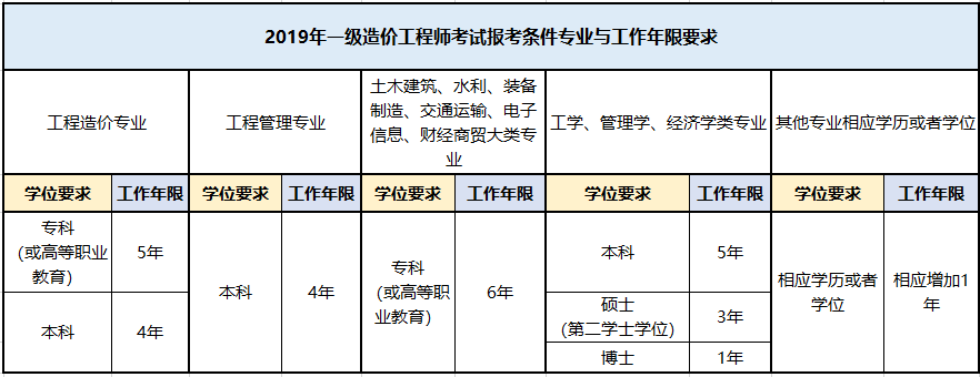 2019年一級造價工程師考試的備考過程已經(jīng)開始,相信很多湖北武漢市江岸區(qū)、江漢區(qū)、硚口區(qū)、漢陽區(qū)、武昌區(qū)、洪山區(qū)、青山區(qū)的朋友們都非常關心湖北武漢2019年一級造價工程師考試需要幾年工作經(jīng)驗的這一問題。為此,建設工程教育網(wǎng)的小編整理了關于湖北武漢2019年一級造價工程師考試的報考條件的文章。其中包括湖北武漢岸區(qū)、江漢區(qū)、硚口區(qū)、漢陽區(qū)、武昌區(qū)、洪山區(qū)、青山區(qū)2019年一級造價工程師考試的報考專業(yè)要求、學位要求以及從事工程造價業(yè)務工作的工作年限。具體如下表格: