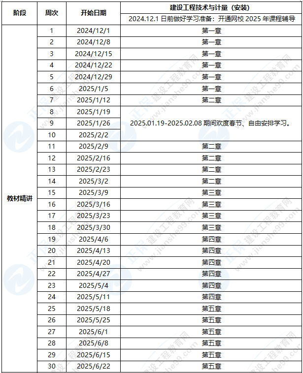 1、整體進度說明:本計劃表從2024年12月1日開始執(zhí)行,計劃于2025年6月30日結(jié)束,共計30周;其中:教材精講階段安排27周,春節(jié)調(diào)整階段3周。學(xué)員可根據(jù)本表的提示,結(jié)合自己的工作,學(xué)習(xí)情況進行細(xì)化,并按網(wǎng)校要求完成聽課、做題的學(xué)習(xí)任務(wù),基本可滿足考試需要。