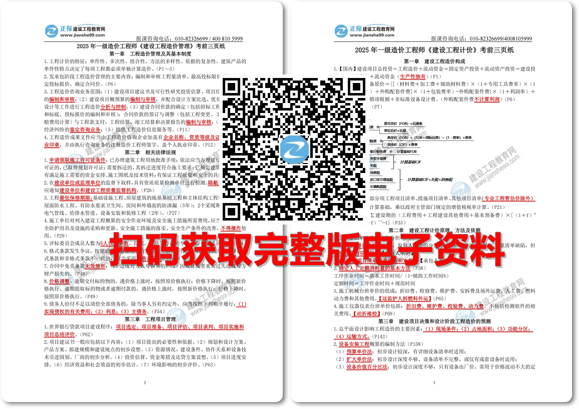 別再猶豫,抓住最后的備考時機。掃碼免費領取考前三頁紙,讓它們成為你沖刺備考的加速器。相信自己,通過努力和科學備考,你一定能在2025年的一級造價師考試中取得優(yōu)異的成績!