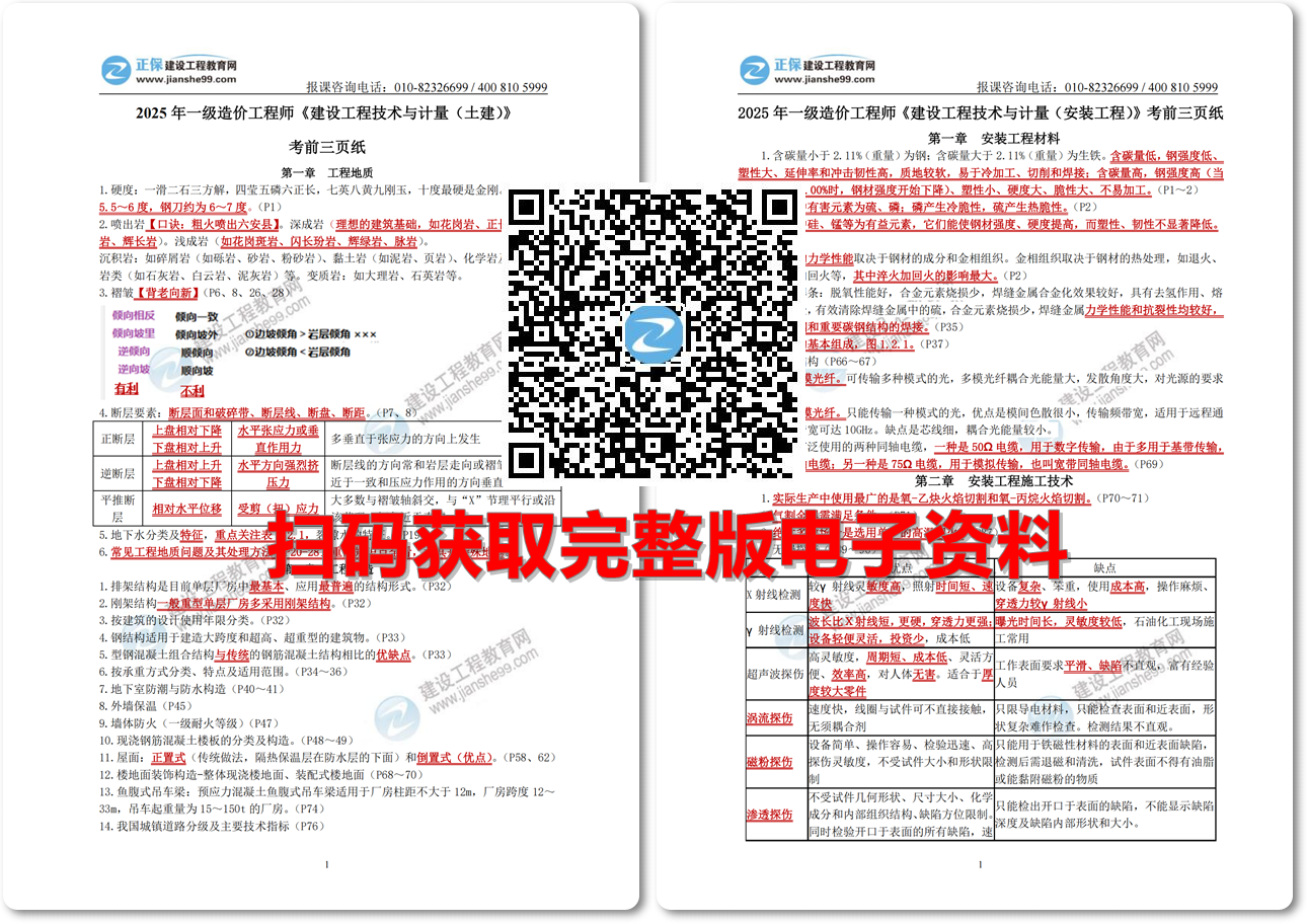 考前三頁紙,是專門為考生們精心打造的備考利器。它涵蓋了《建設工程造價管理》 《建設工程計價》 《建設工程技術與計量(土建、安裝)》 《建設工程造價案例分析(土建、安裝)四個科目的核心考點。這些內(nèi)容都是考試的重點、難點,通過簡潔明了的方式呈現(xiàn),幫助你在有限的時間內(nèi)迅速掌握關鍵知識點。