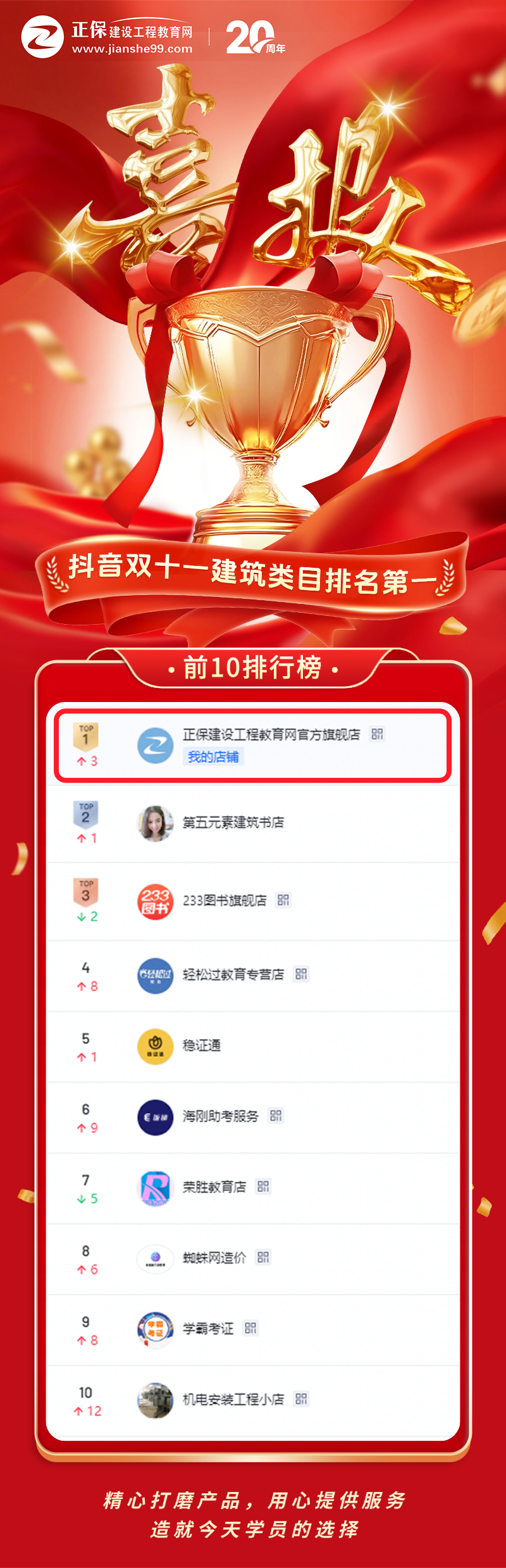 抖音官方榜單新鮮出爐!在剛剛過去的爽十一大戰(zhàn)中,正保建設(shè)工程教育網(wǎng)抖音旗艦店】以絕對(duì)優(yōu)勢登頂建筑類目排行榜NO.1!這是繼“20周年”之后,我們送給全體建工學(xué)子與行業(yè)同仁的又一份硬核成績單!感謝各位同學(xué)用信任與認(rèn)可,把網(wǎng)校托舉至抖音官方榜的巔峰。二十載春秋,我們始終懷揣初心,各位考生每一次下單、好評(píng)與通關(guān)拿證,都是照亮我們繼續(xù)前行的燈塔。未來,我們將以更精品的課程、更貼心的服務(wù),陪伴更多建工人把“建筑夢(mèng)”照進(jìn)現(xiàn)實(shí),攜手再攀下一座行業(yè)高峰!
